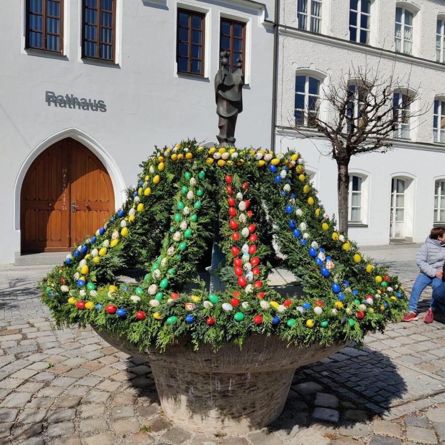 Mit einem Gläschen Sekt wurde heuer auf den zum 20. Mal vom Obst- und Gartenbauverein Gangkofen gestalteten Osterbrunnen am Marktplatz angestoßen.